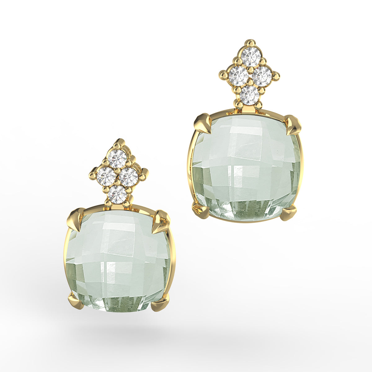 14 karat yellow gold polish-finished drop earrings, set with 7.2ct 10mm checkerboard-cut cushion-shaped semi-precious green amethyst color stones and accented with 0.20 carat diamonds