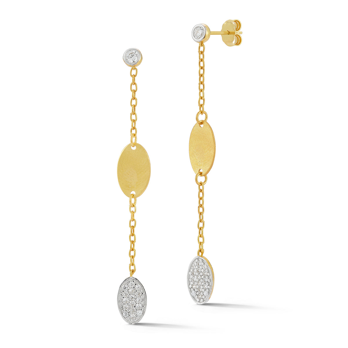 14 karat yellow gold mixed matte and polish-finished dangling gold and diamond oval-shaped motif earrings, accented with 0.23 carats of pave set diamonds