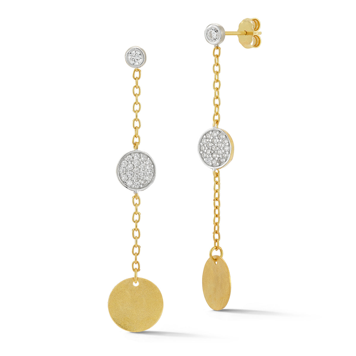 14 karat yellow gold mixed matte and polish-finished dangling gold and diamond round-shaped motif earrings, accented with 0.27 carats of pave set diamonds