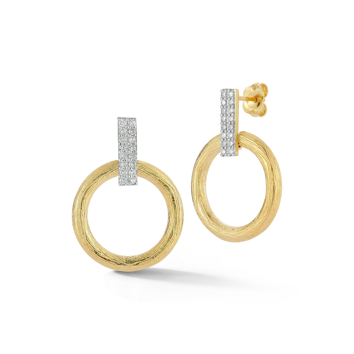 14 karat yellow gold polish and texture-finished open circle earrings, accented with 0.32 carats of pave set diamonds