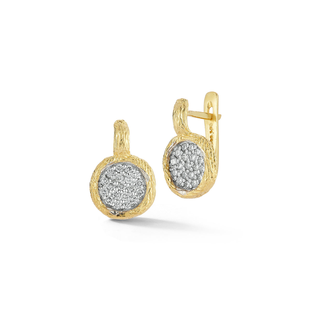 14 karat yellow gold polish and texture-finished drop circle earrings, centered with 0.38 carats of pave set diamonds