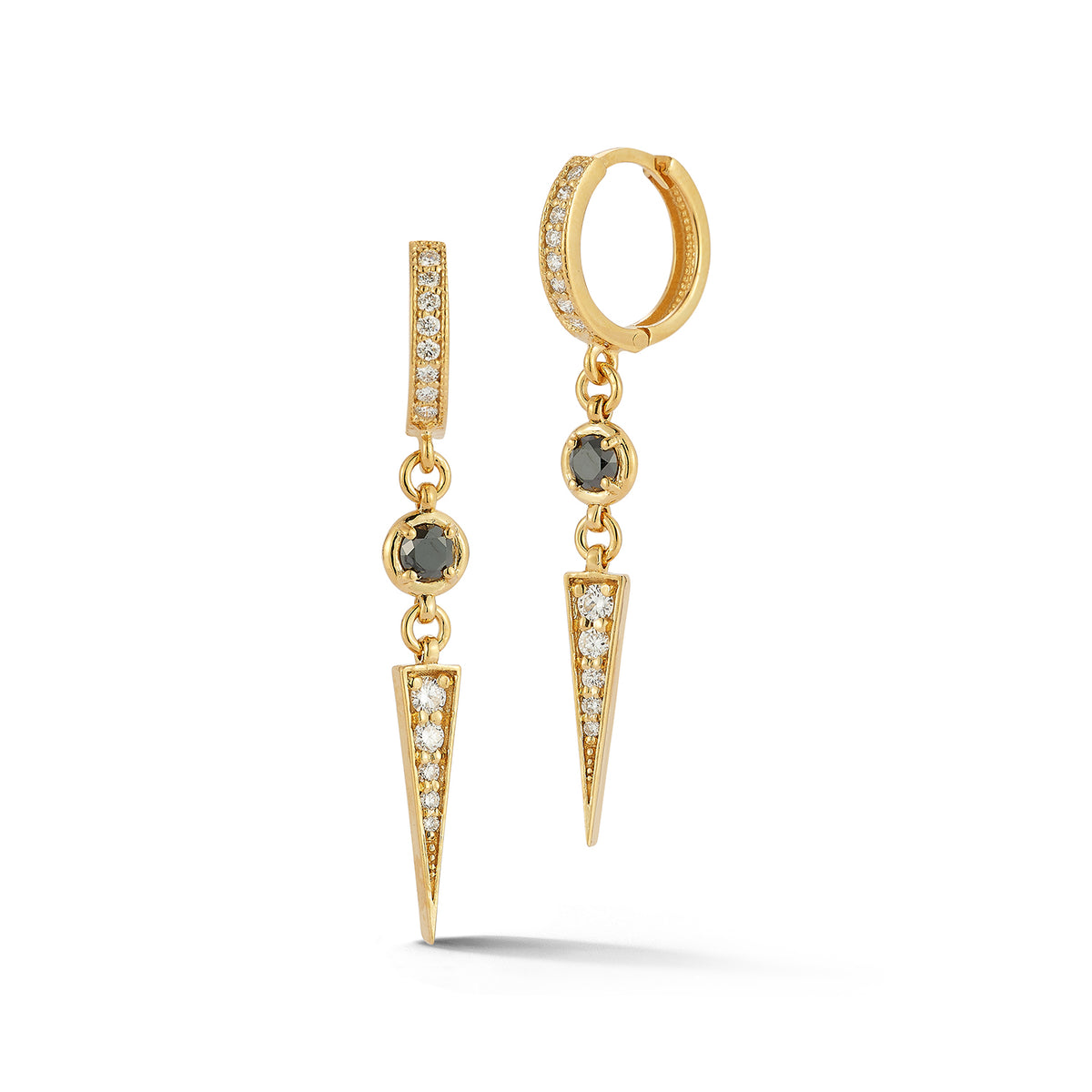 14 karat yellow gold polish-finished huggies earrings, designed with dangling triangle-shaped motifs and accented with 0.58 carats of mixed pave, bezel and white and black diamonds