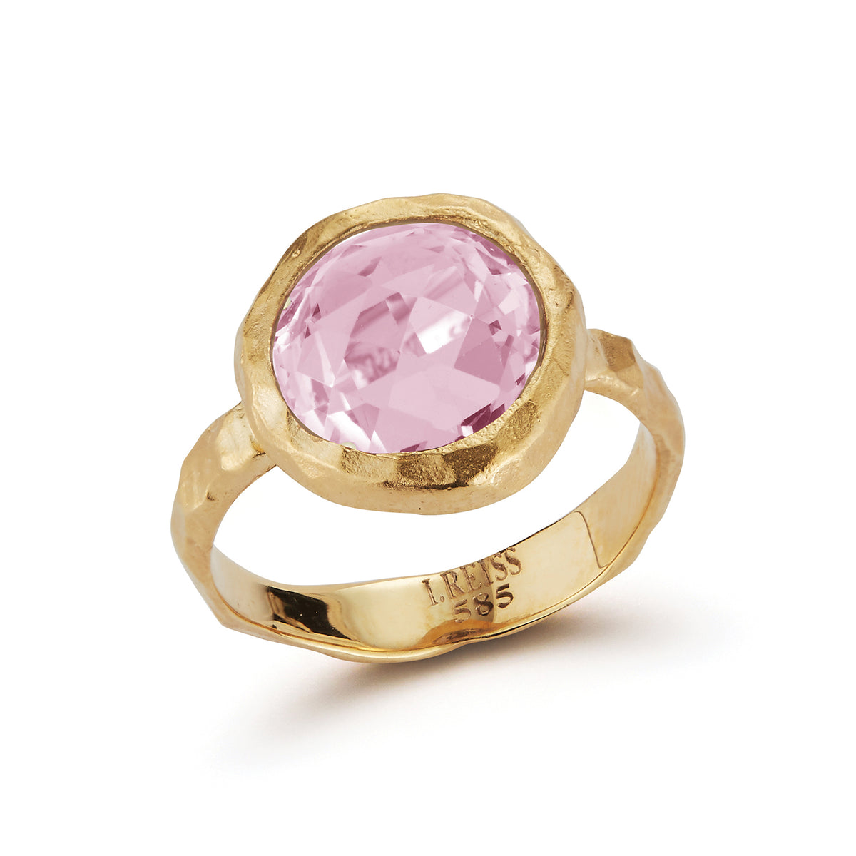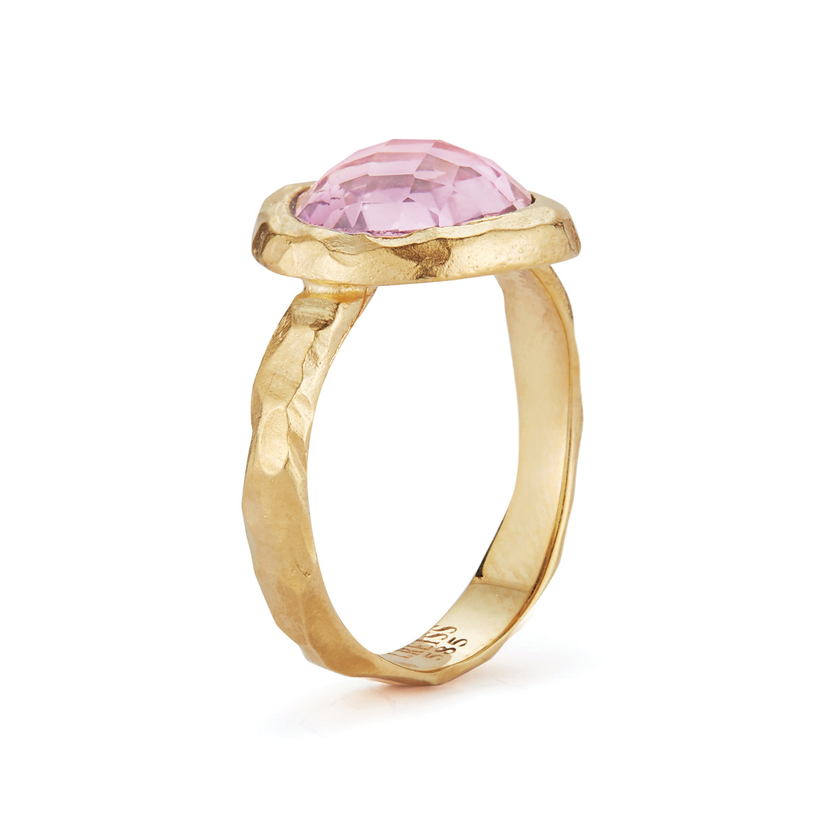 14 karat yellow gold matte and hammer-finished cocktail ring, set with a 3.12ct 10mm round checkerboard-cut rose quartz semi-precious color stone.
