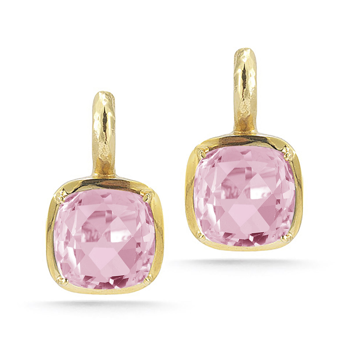 14 karat yellow gold matte and hammer-finished drop earrings, set with 6.7ct 10mm cushion-shaped checkerboard-cut rose quartz semi-precious color stones