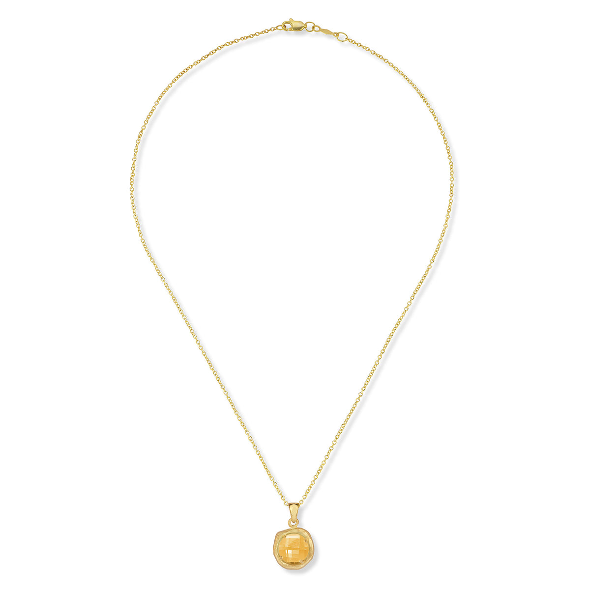 14 karat yellow gold matte and hammer-finished pendant, centered with an 8mm 1.75ct checkerboard-cut citrine semi-precious color stone, sliding on a 16" rolo chain