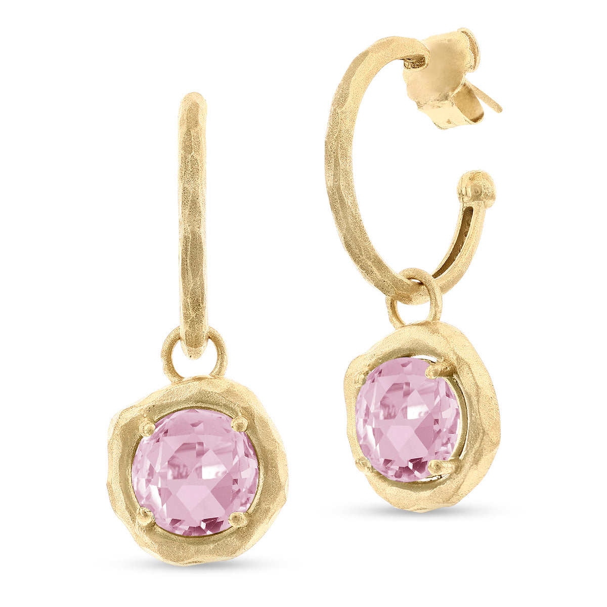 14 karat yellow gold matte and hammer-finished 8mm hoop earrings, set with dangling 8mm round checkerboard-cut 3.6ct rose quartz semi-precious color stone charms