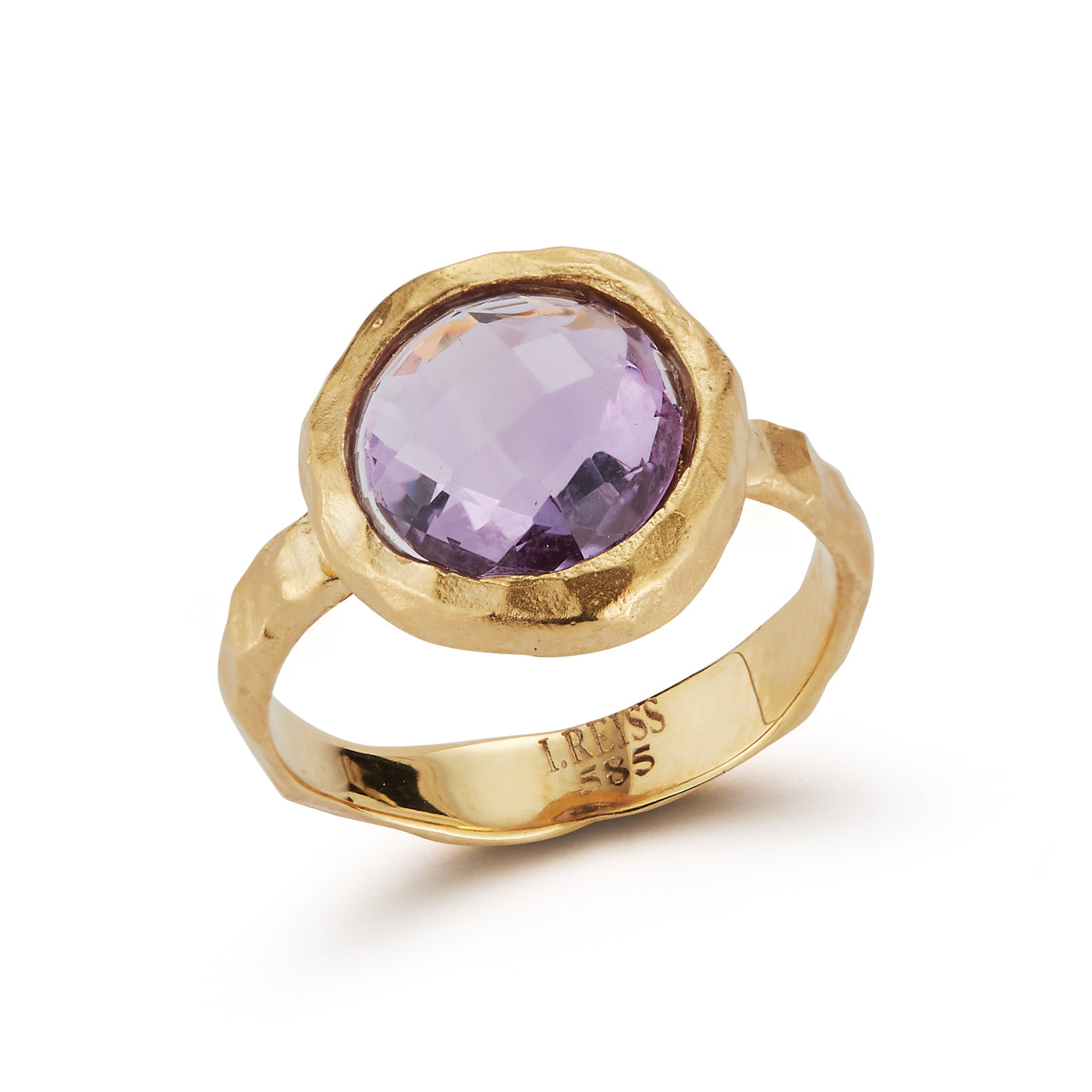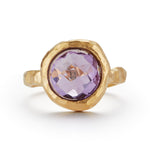 14 karat yellow gold hand-crafted matte and hammer-finished ring, centered with a 10mm amethyst semi-precious checkerboard cut color stone.