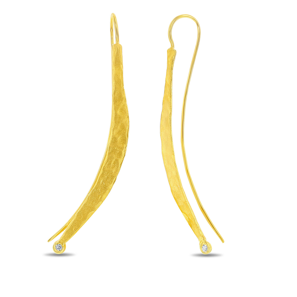 14 karat yellow gold matte and hammer-finished dangling wire earrings, accented with 0.04 carats of bezel set diamonds.