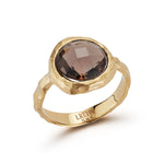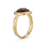 14 karat yellow gold hand-crafted matte and hammer-finished ring, centered with a 10mm smokey topaz semi-precious checkerboard cut color ring.