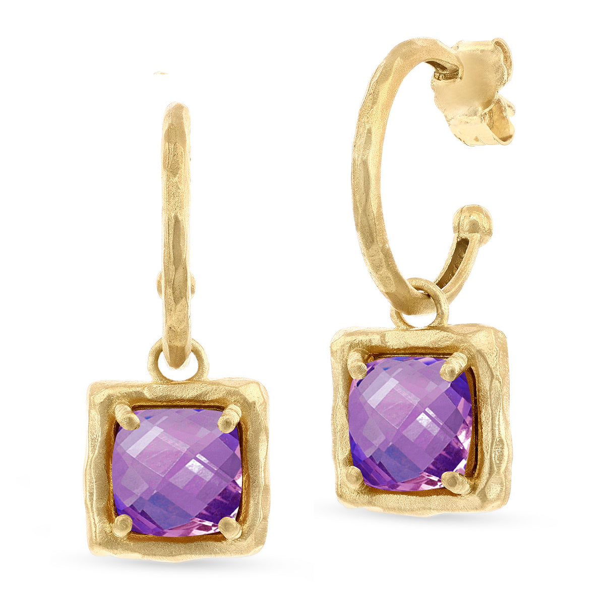 14 karat yellow gold matte and hammer-finished 8mm hoop earrings, set with dangling 8mm cushion-shaped checkerboard-cut 4.0ct amethyst semi-precious color stone charms