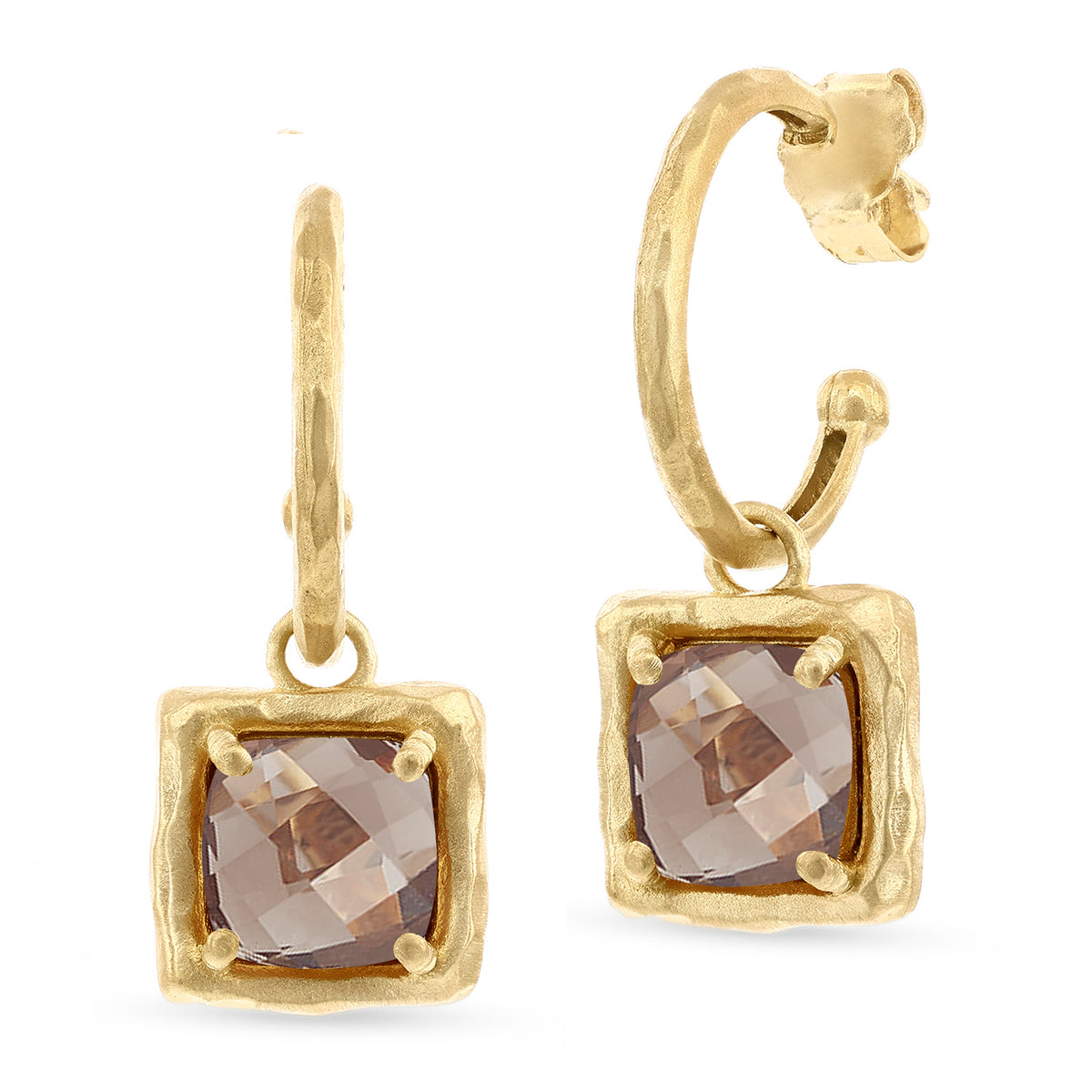 14 karat yellow gold matte and hammer-finished 8mm hoop earrings, set with dangling 10mm cushion-shaped checkerboard-cut 7ct smokey topaz semi-precious color stone charms