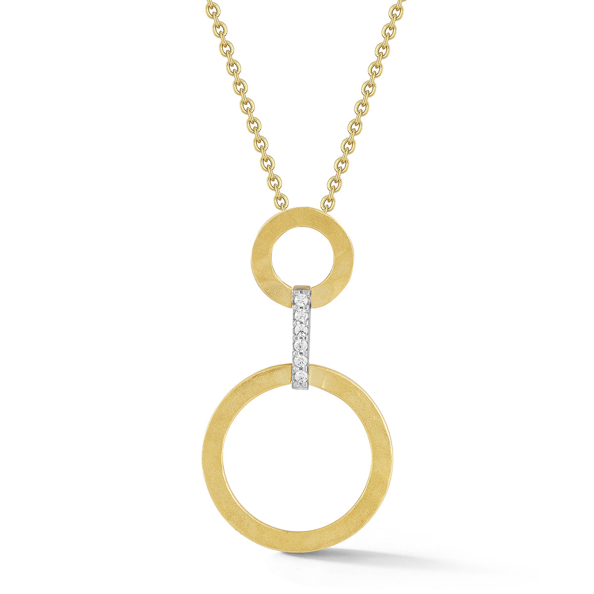 14 karat yellow gold matte-finished two open circles pendant, accented with 0.04 carats of a pave set diamond link, sliding on a 16" rolo chain