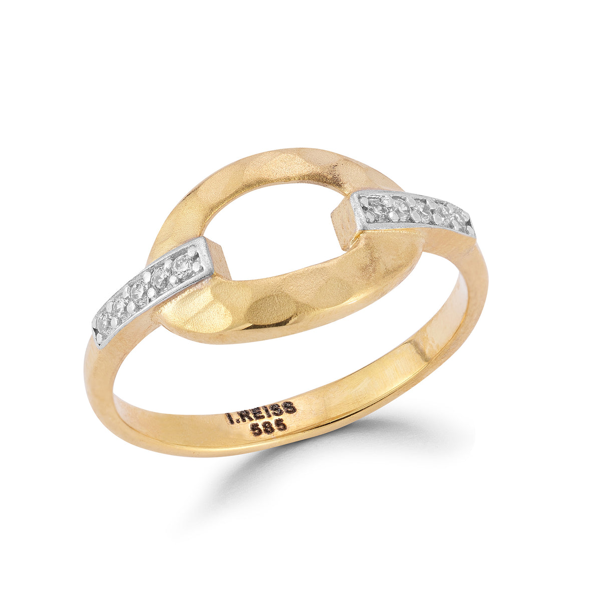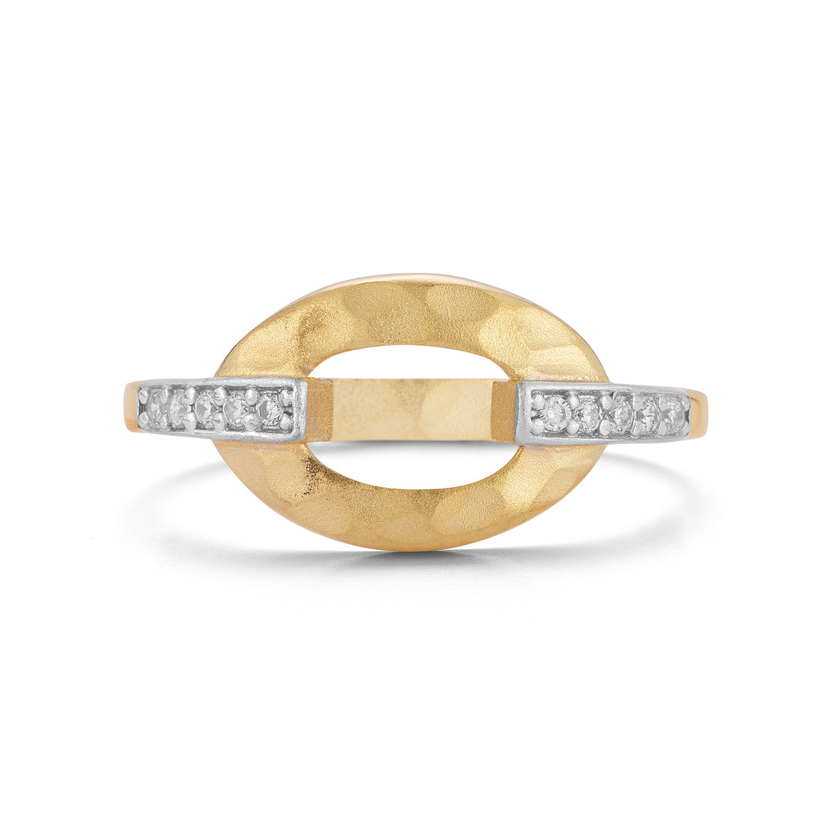 14 karat yellow gold matte and hammer-finished open oval ring, accented with 0.05 carats of pave set diamonds