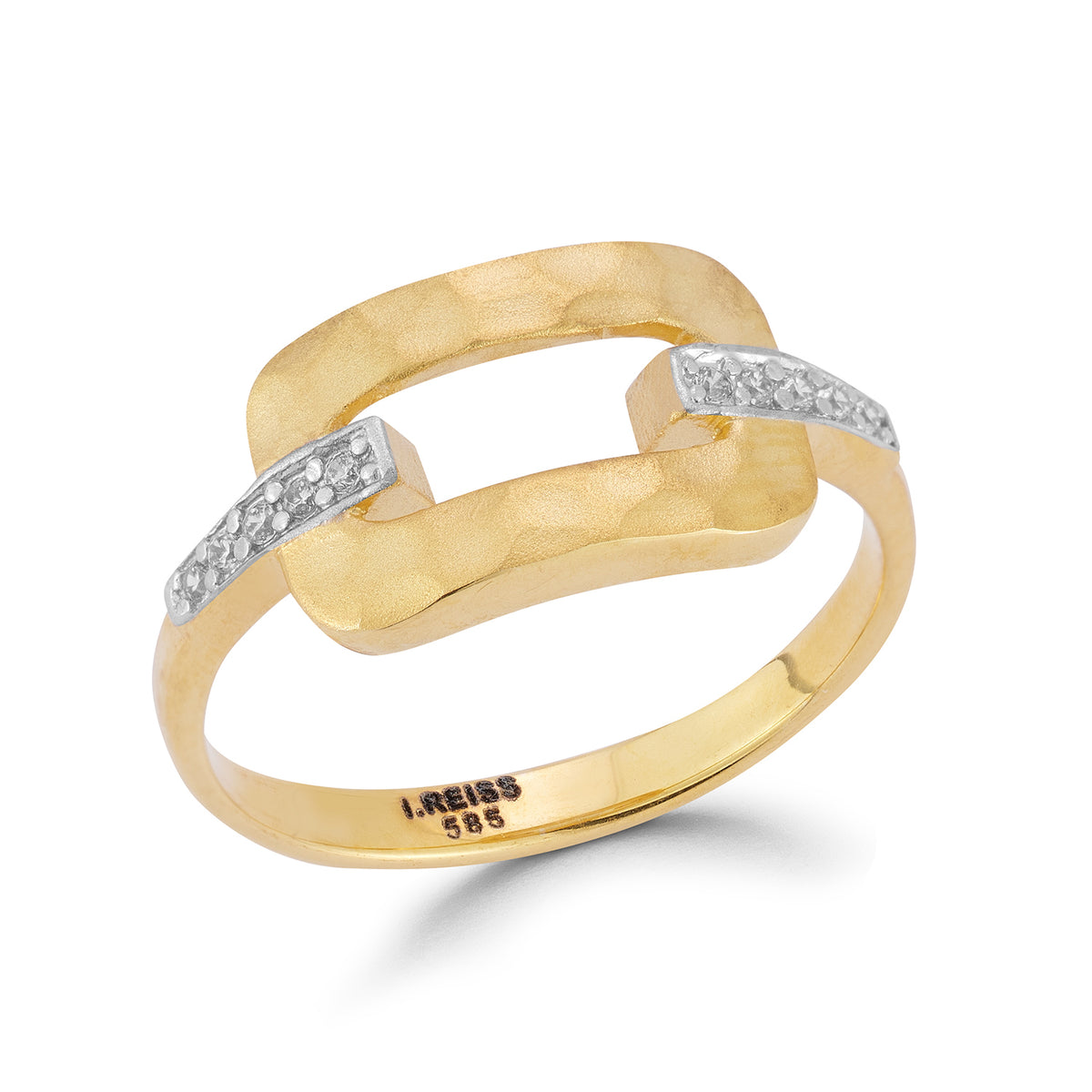 14 karat yellow gold matte and hammer-finished open rectangle ring, accented with 0.05 carats of pave set diamonds