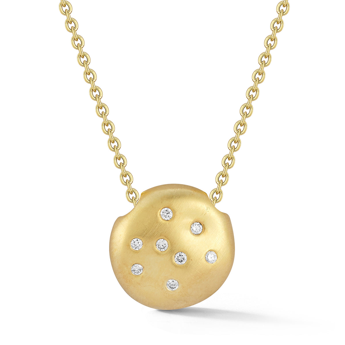 14 karat yellow gold satin-finished round-shaped pendant, accented with 0.08 carats of burnish set diamonds on a 16" rolo chain