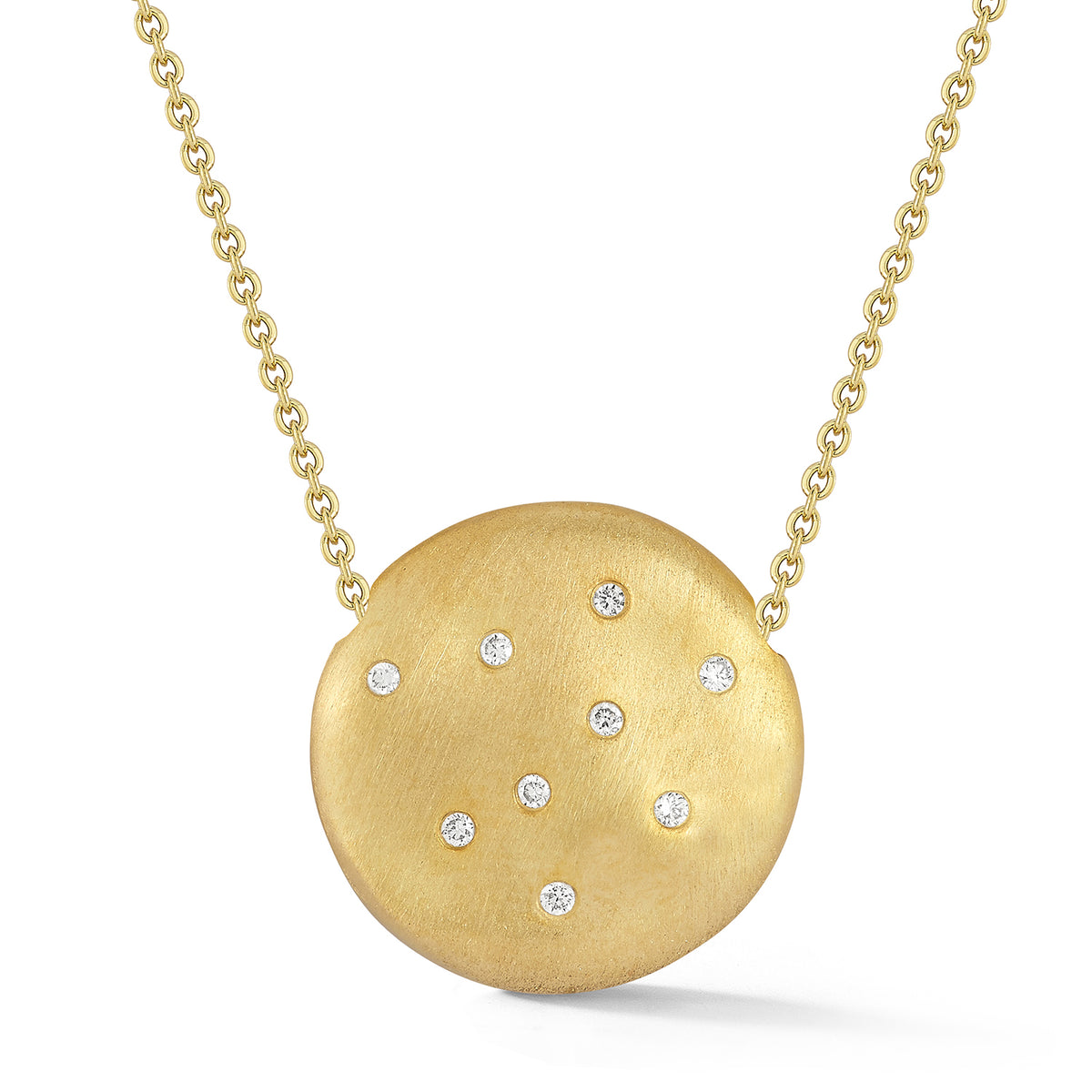 14 karat yellow gold matte and hammer-finished disc-shaped pendant, accented with 0.09 carats of burnish set diamonds on a 16" rolo chain