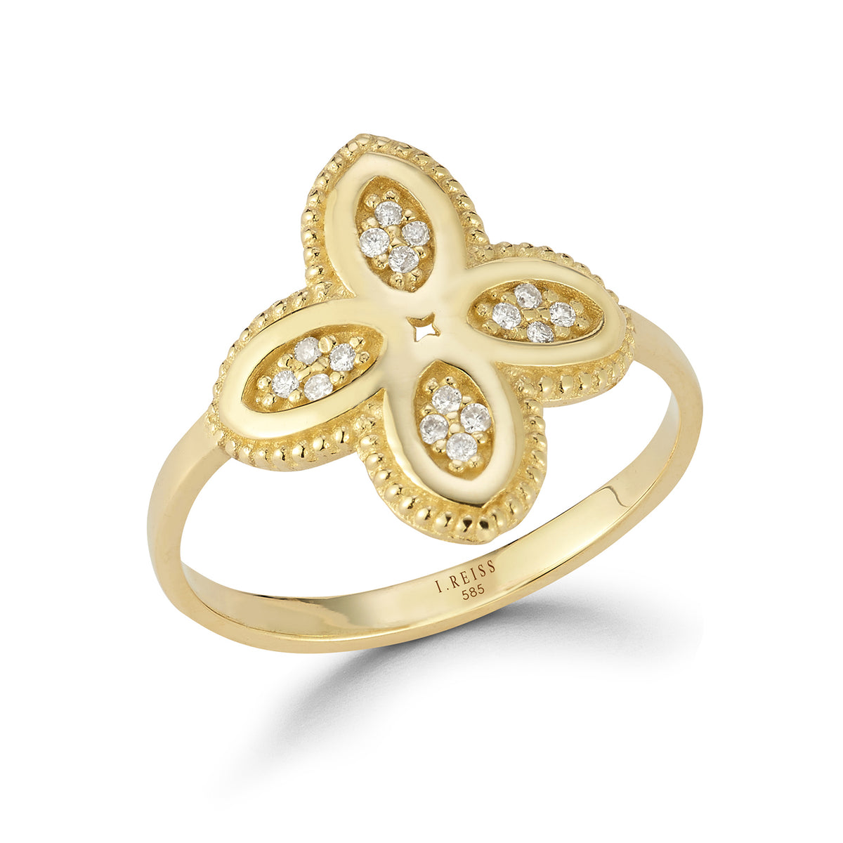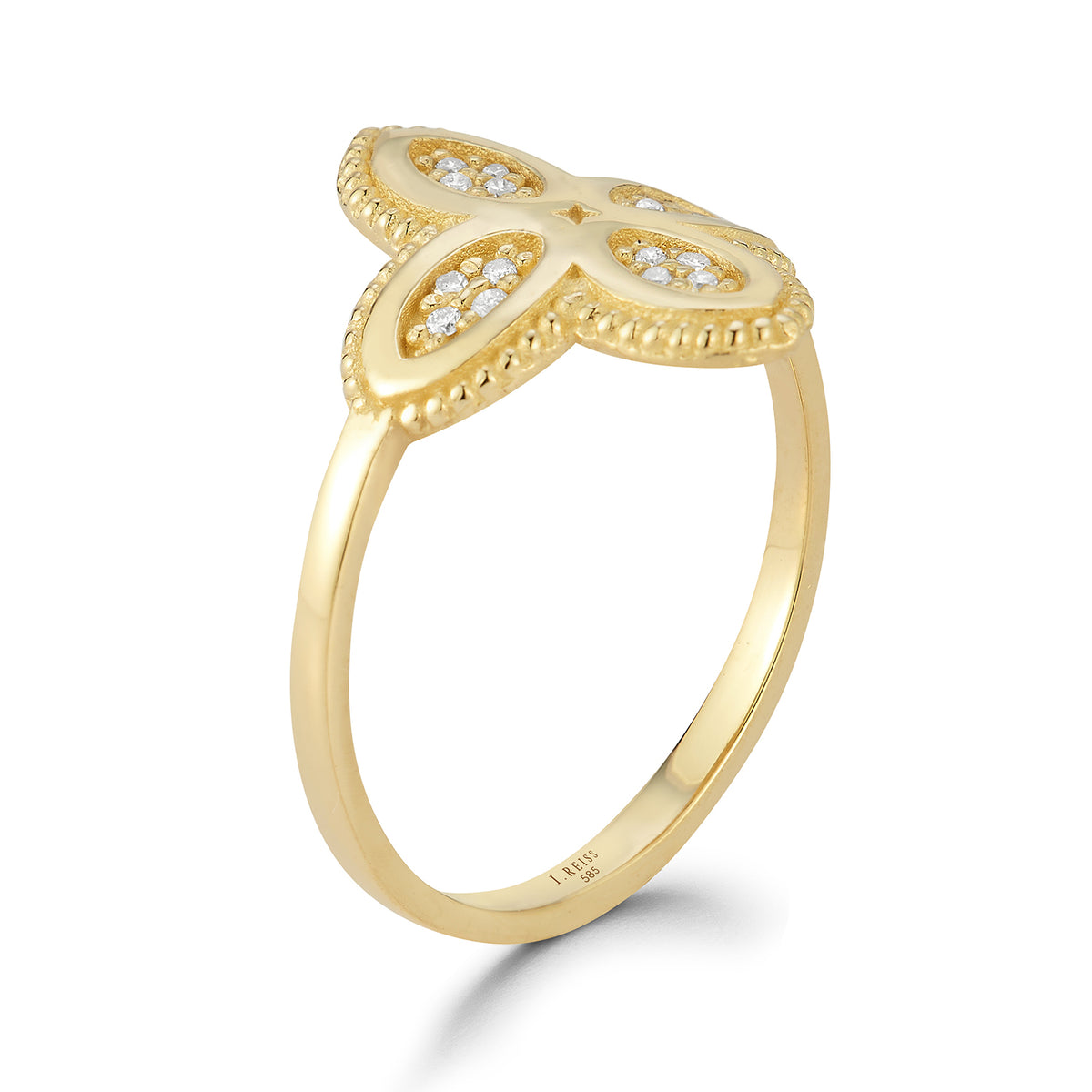 14 karat yellow gold polish-finished 4-clover ring, accented with 0.10 carats of pave set diamonds.