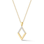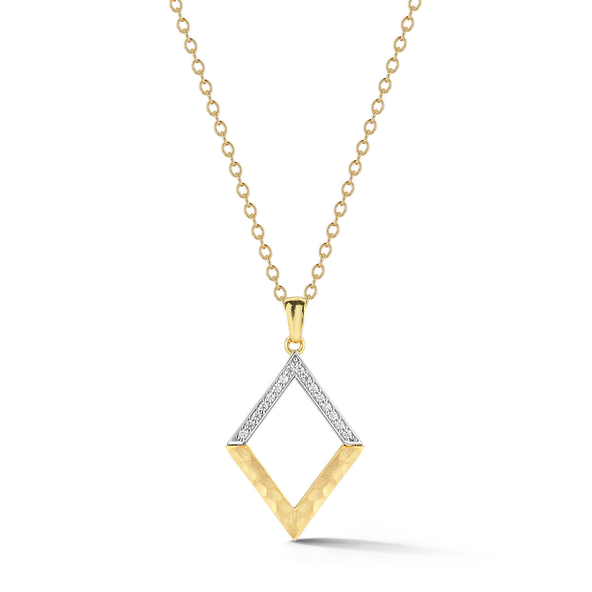14 karat yellow gold matte and hammer-finished open diamond-shaped pendant, accented with 0.10 carats of pave set diamonds, sliding on a 16" rolo chain