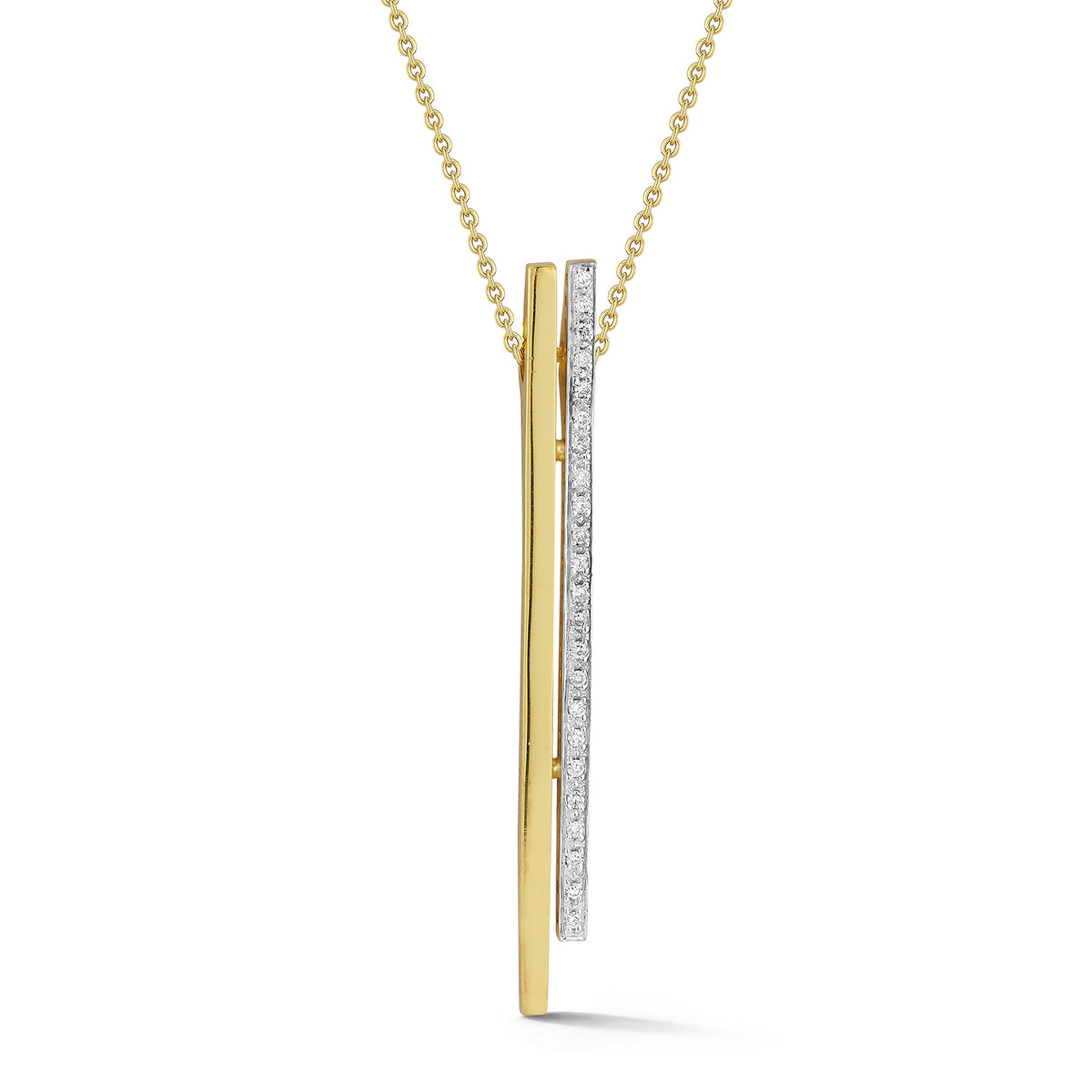 14 karat yellow gold polish-finished diamond and gold bar pendant, enhanced with 0.14 carats of pave set diamonds, on a 16" rolo chain
