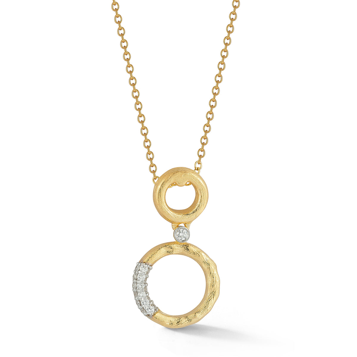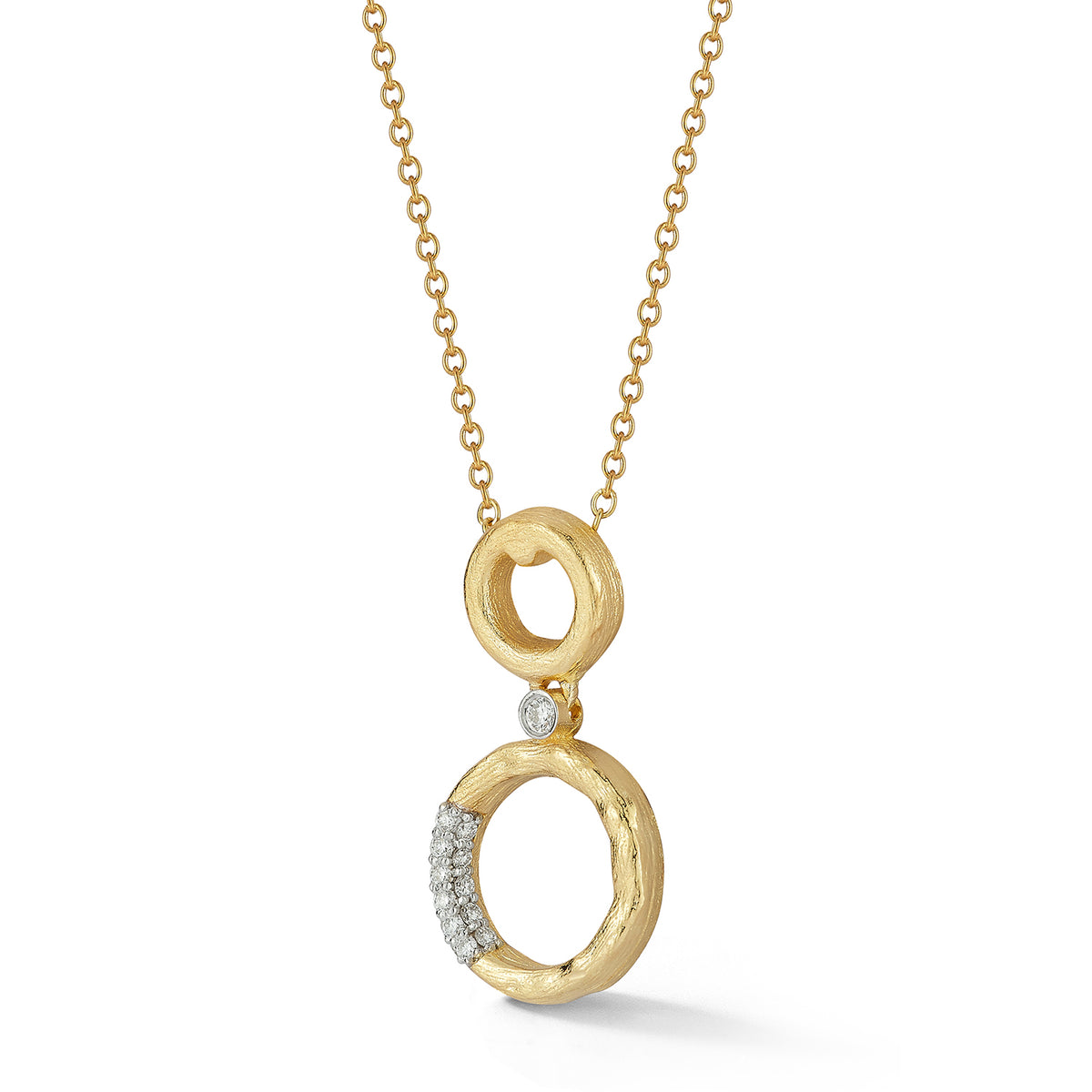 14 karat yellow gold polish and hammer-finished graduating open circle pendant, accented with 0.20 carats of pave and bezel set diamonds, sliding on a 16" rolo chain