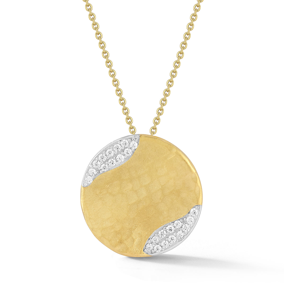 14 karat yellow gold matte and hammer-finished 21mm round pendant, accented with 0.27 carats of pave set diamonds, and sliding on a 16" rolo chain