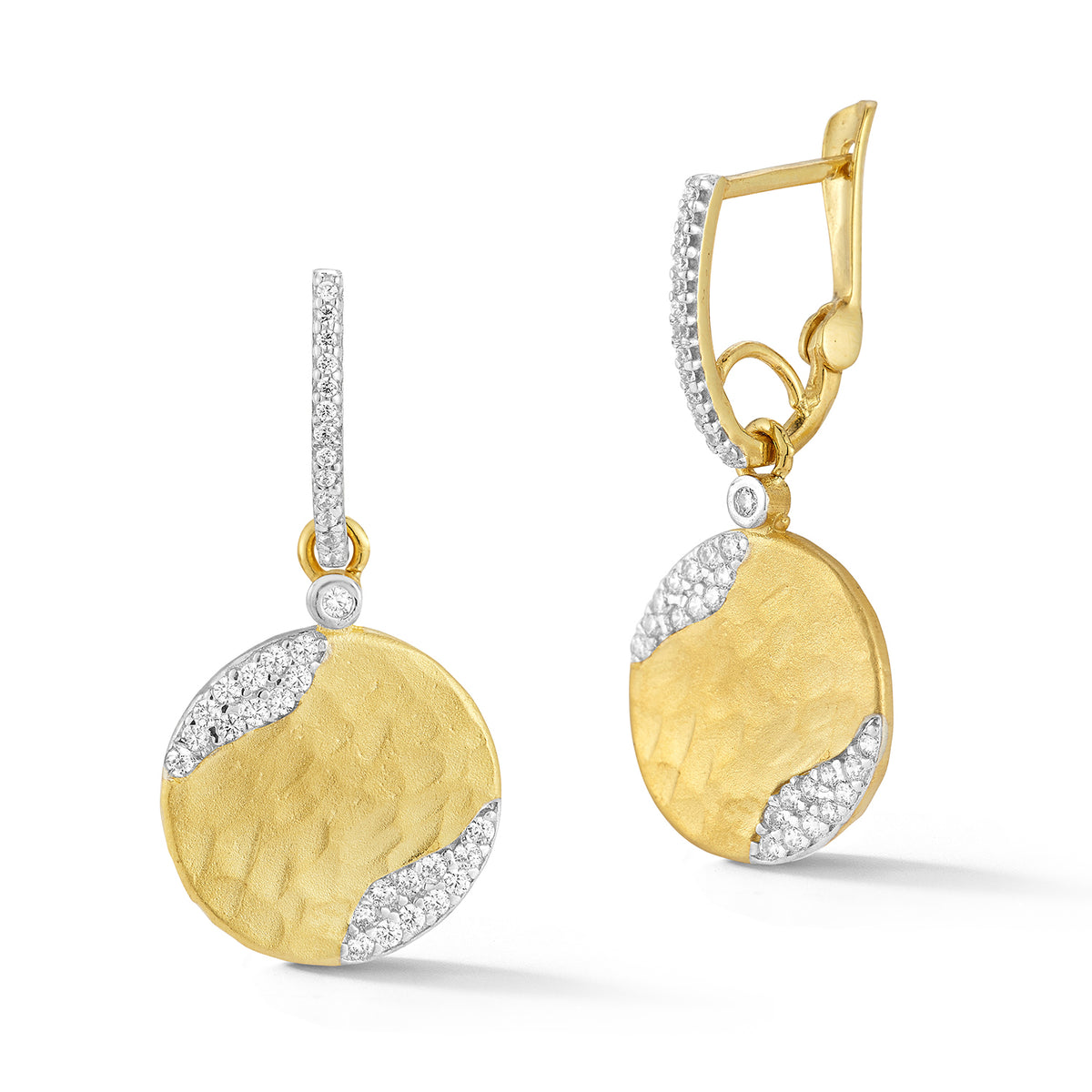 14 karat yellow gold matte and hammer-finished dangling gallery earrings, accented with 0.60 carats of pave set diamonds