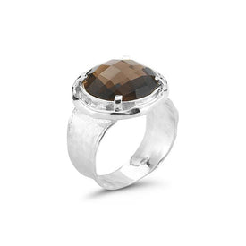 14 karat yellow gold matte and hammer-finished ring, centered with an 8mm 1.75ct round-shaped checkerboard cut amethyst semi-precious color stone surrounded by 0.18 carat of pave set diamonds.