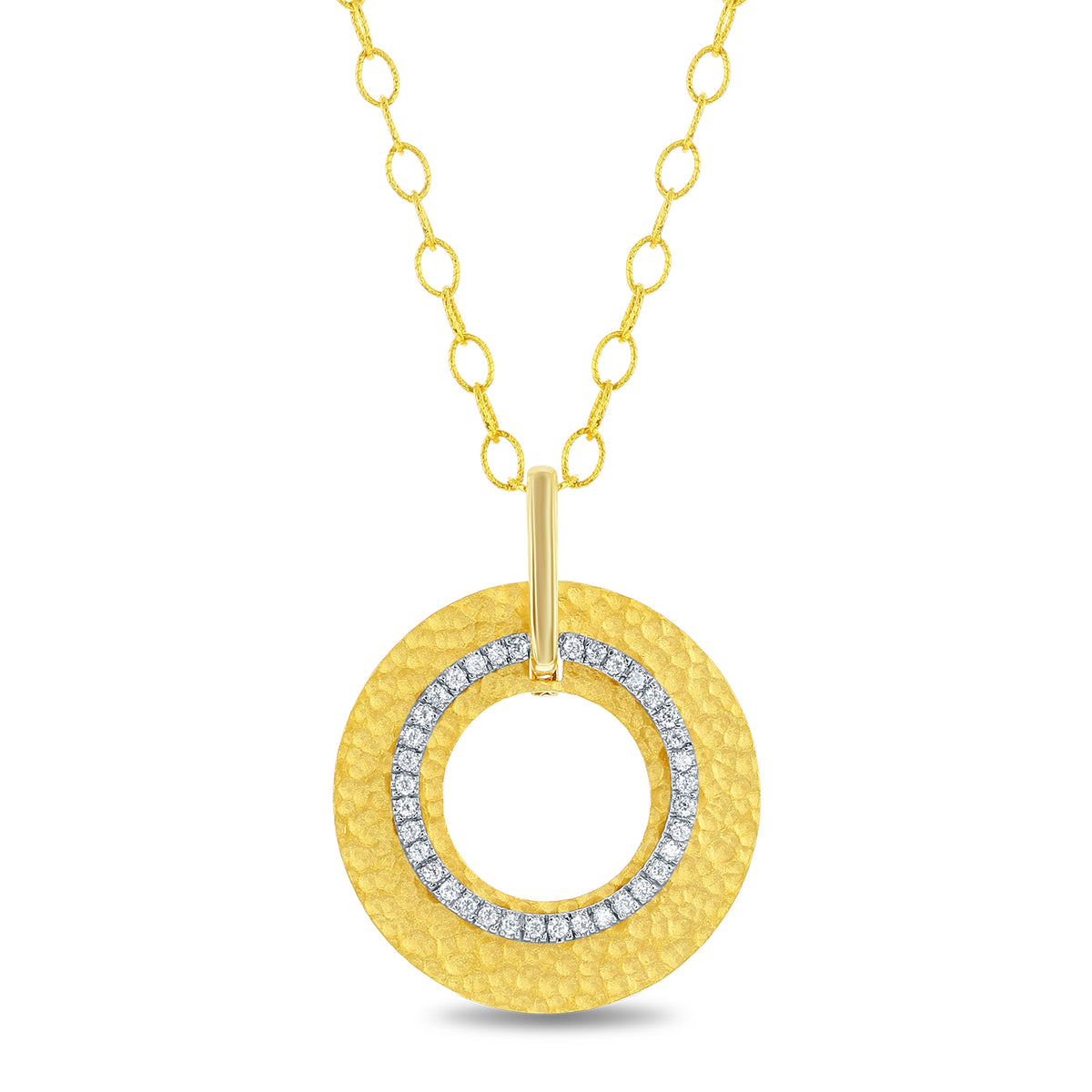 14 karat yellow gold matte and hammer-finished circle pendant, enhanced with 0.40 carats of pave set diamonds, sliding on a 16" rolo chain.