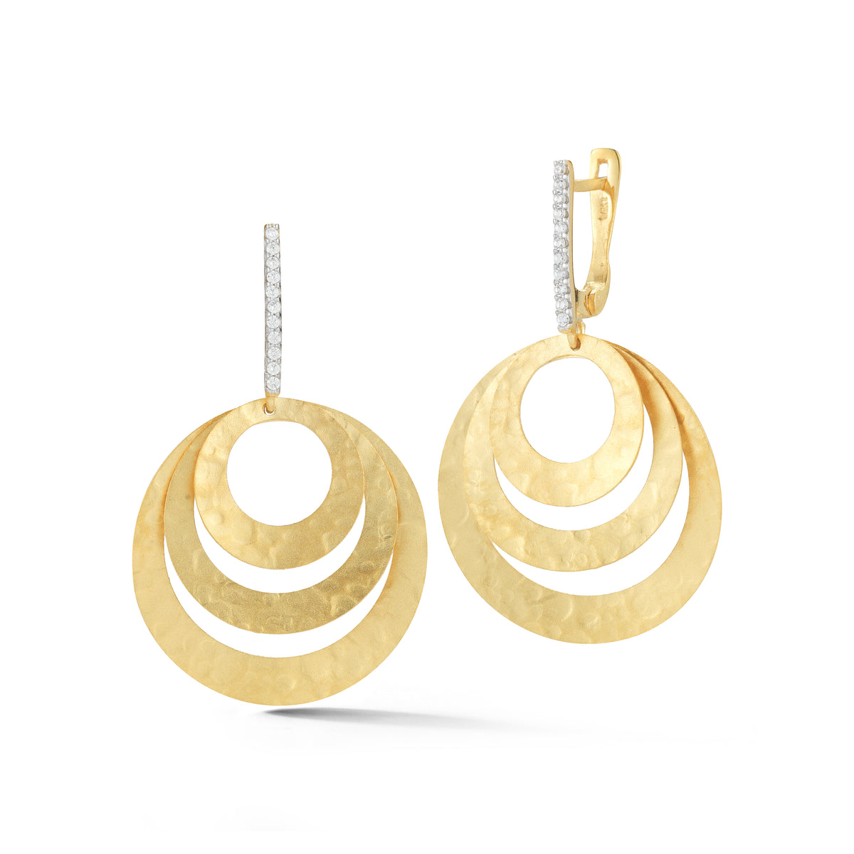 14 karat yellow gold matte and hammer-finished concentric circle earrings accented with 0 15 carats of pave set diamonds