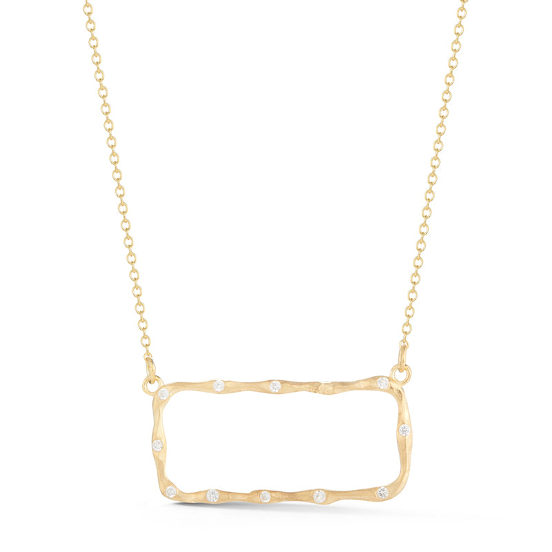 14 karat yellow gold matte-finished east-to-west open rectangle necklace accented with 0 25 carats of burnish set diamonds