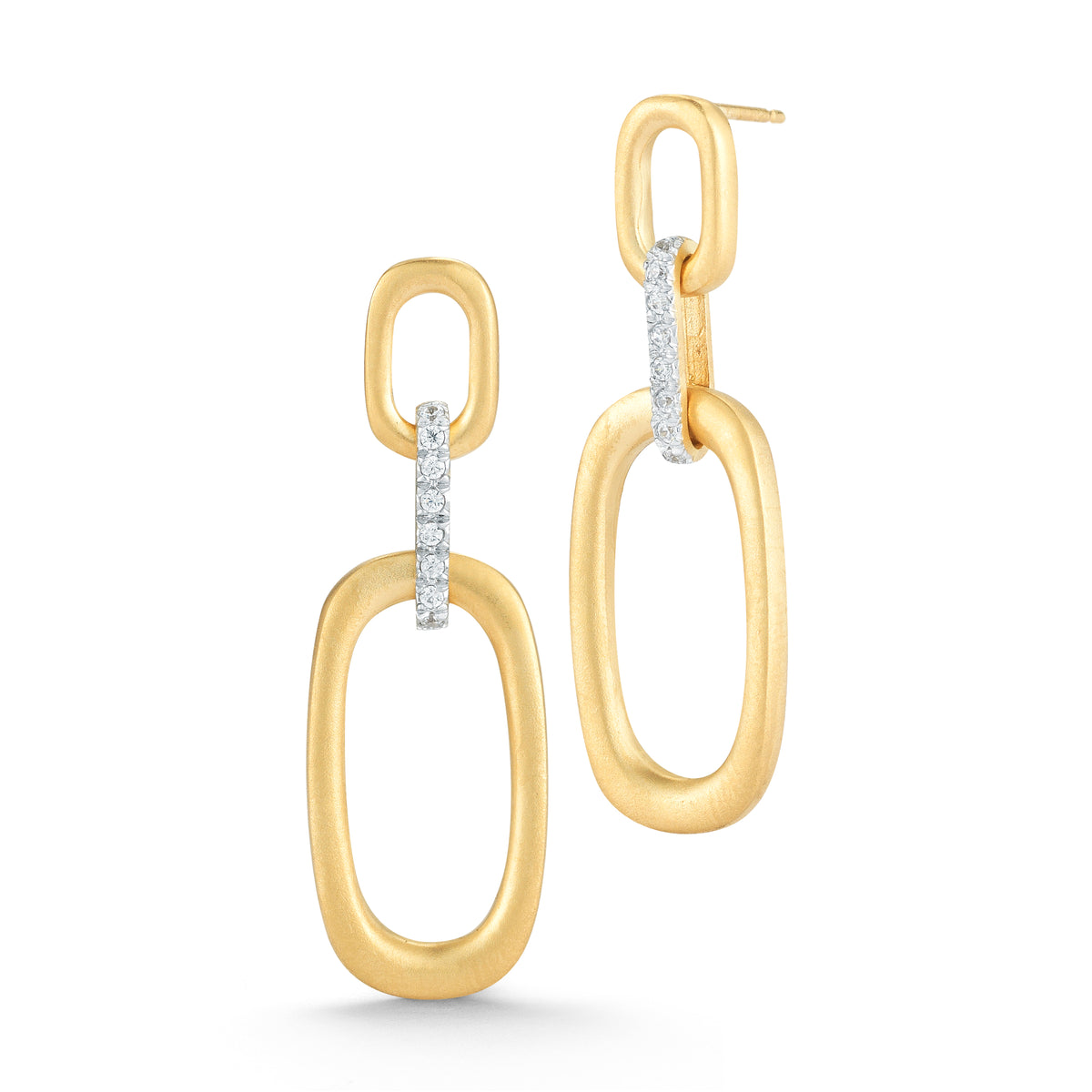 14 karat yellow gold matte-finish dangling earrings accented with 0 25 carat of pave set diamonds
