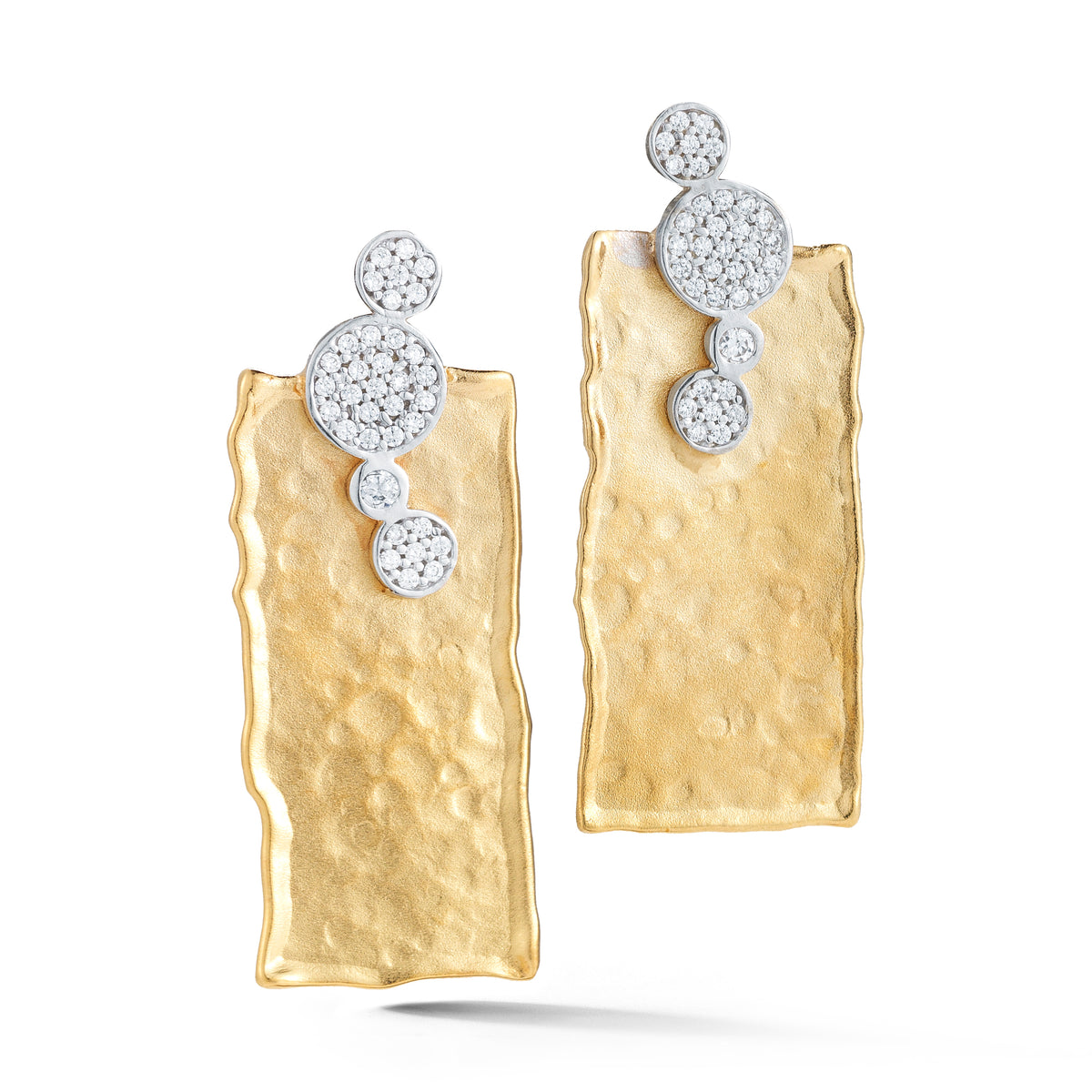 14 karat yellow gold matte and hammer-finished rectangular earrings accented with 0 50 carat of pave set diamond bubbles