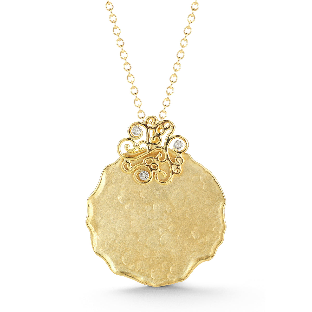 14 karat yellow gold matte and hammer-finish pendant enhanced with a polish-finish filigree design and 0 03 carats of bezel set diamonds sliding on a 16 rolo chain