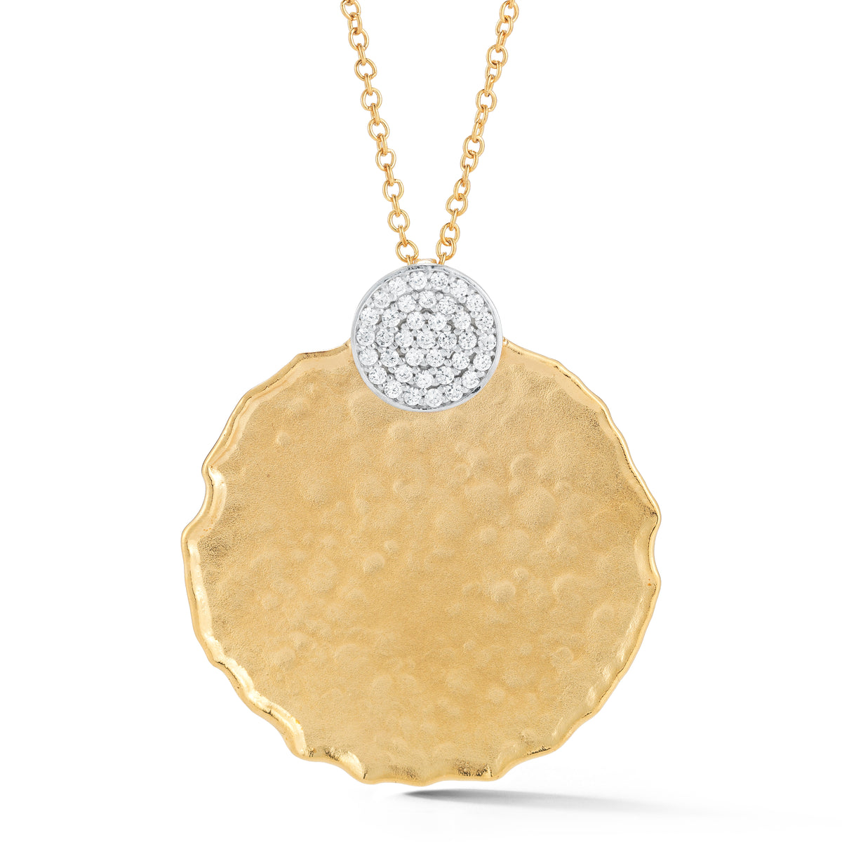 14 karat yellow gold matte and hammer-finish round-shaped pendant enhanced with 0 12 carat of a pave set diamond circle