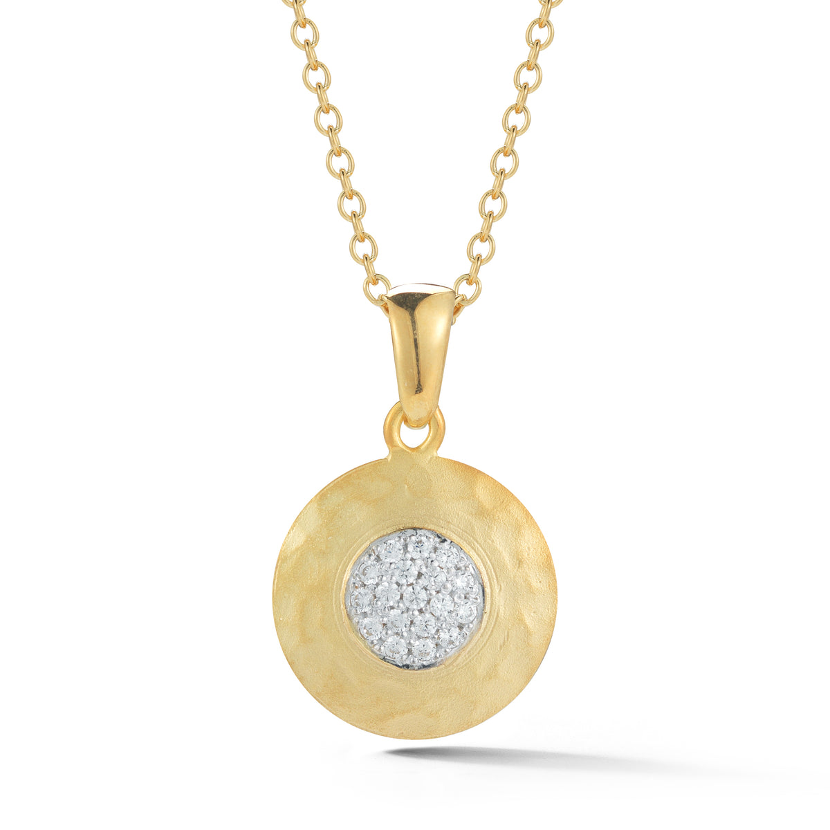 14 karat yellow gold matte and hammer-finish stud pendant centered with 0 12 carats of pave set diamonds sliding on a 16 rolo chain