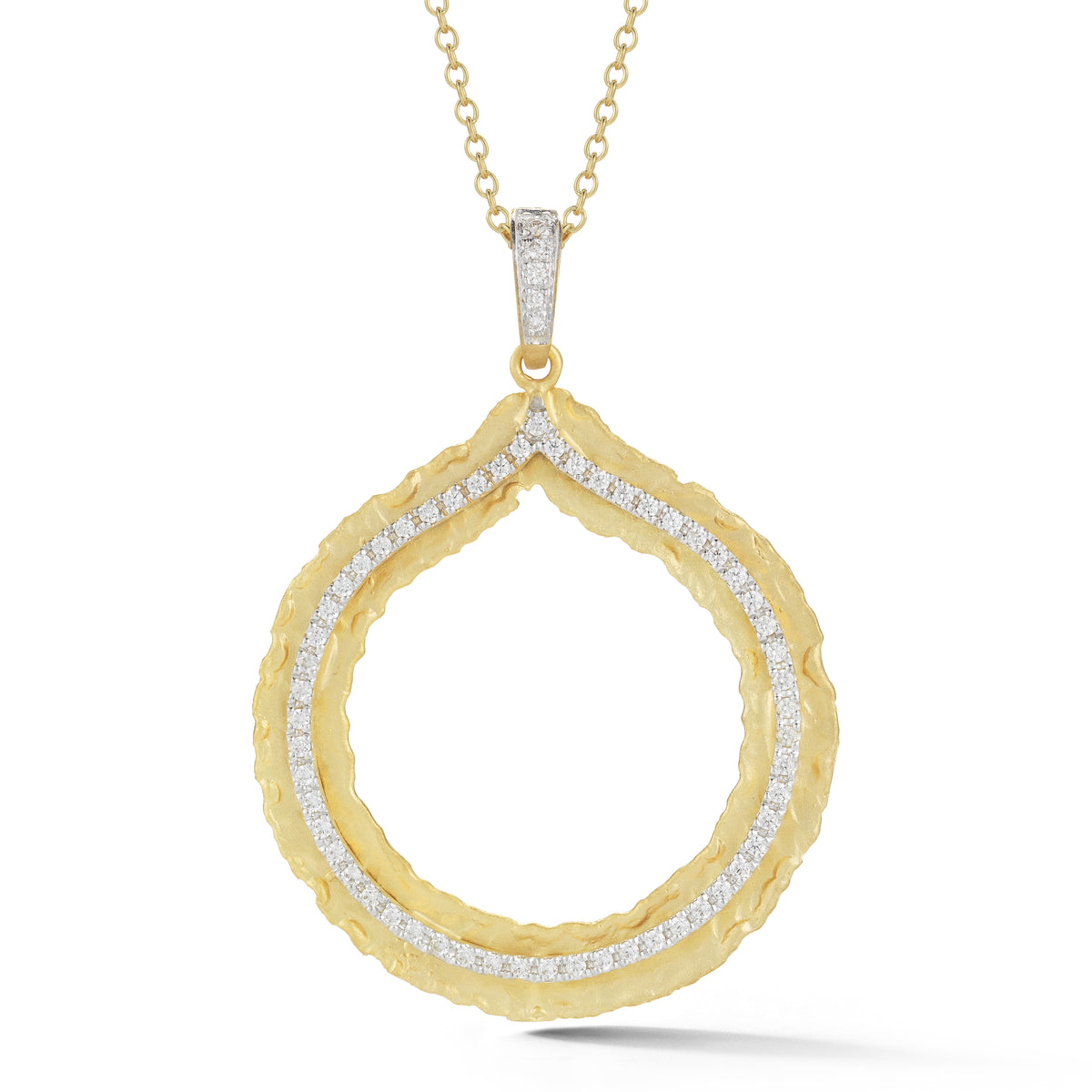 14 karat yellow gold matte and hammer-finished pendant enhanced with 0 45 carat of pave set diamonds