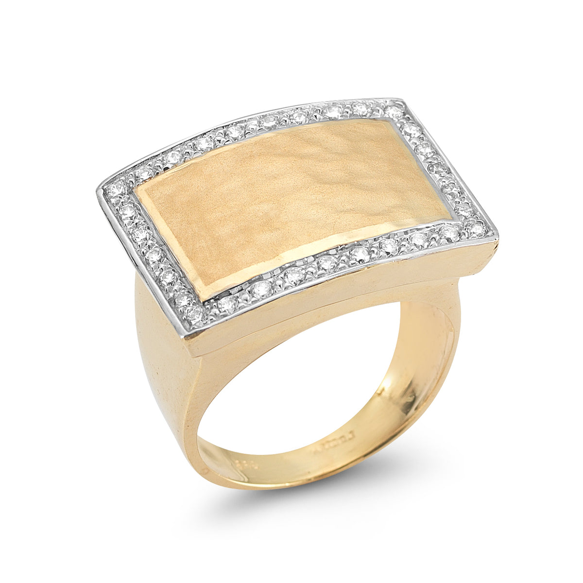 14 karat yellow gold matte and hammer-finish gallery ring enhanced with 0 55 carat of pave set diamonds