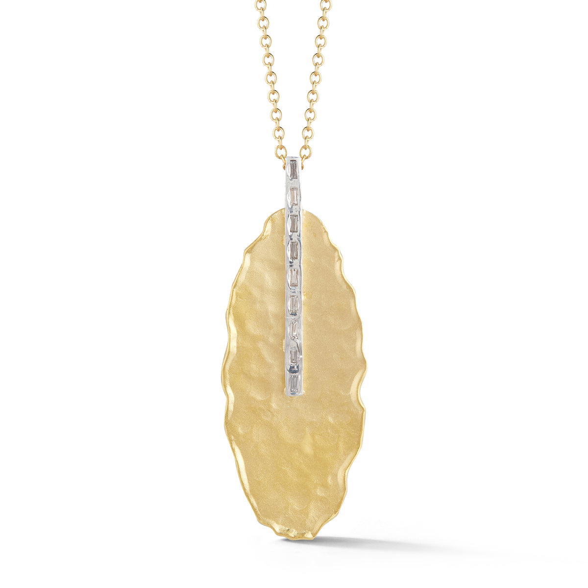14 karat yellow gold matte and hammer-finished oval-shaped pendant accented with 0 15 carats of pave set diamonds sliding on a 16 rolo chain