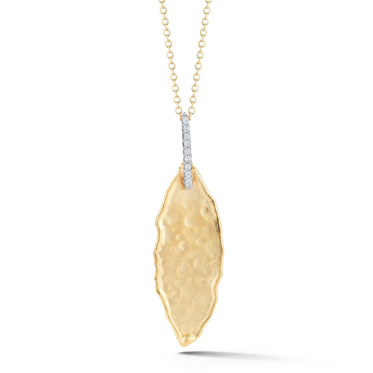 14 karat yellow gold matte and hammer-finished leaf pendant accented with 0 07 carat of pave set diamonds sliding on a 16 rolo chain