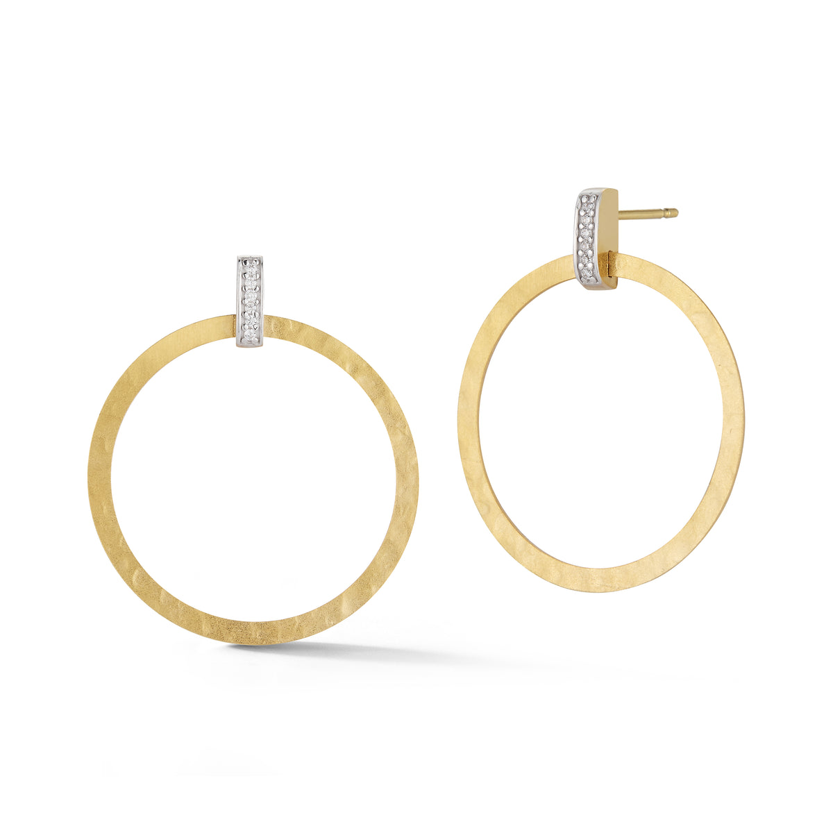 14 karat yellow gold matte and hammer-finished open circle earrings accented with 0 08 carats of pave set diamonds