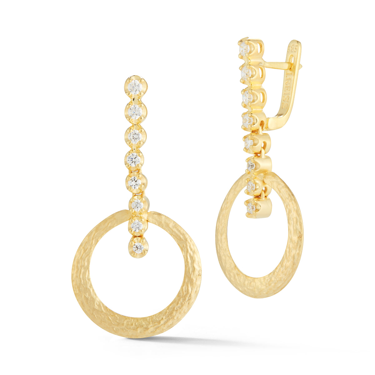 14 karat yellow gold matte and hammer-finished dangling circle earrings accented with 0 35 carats of prong set diamonds