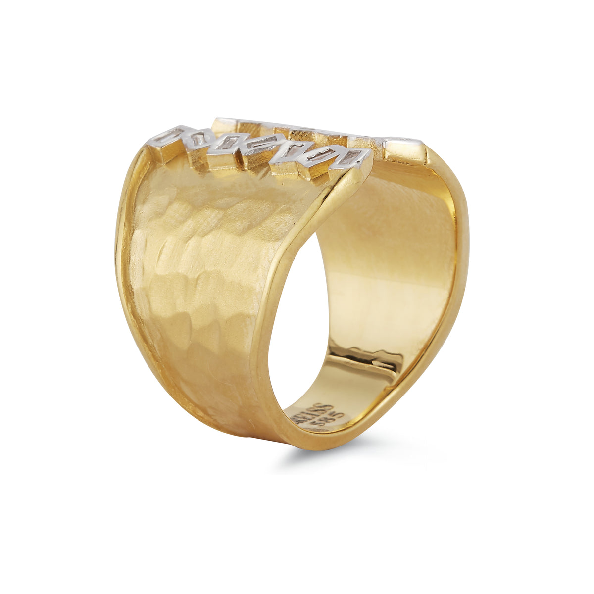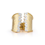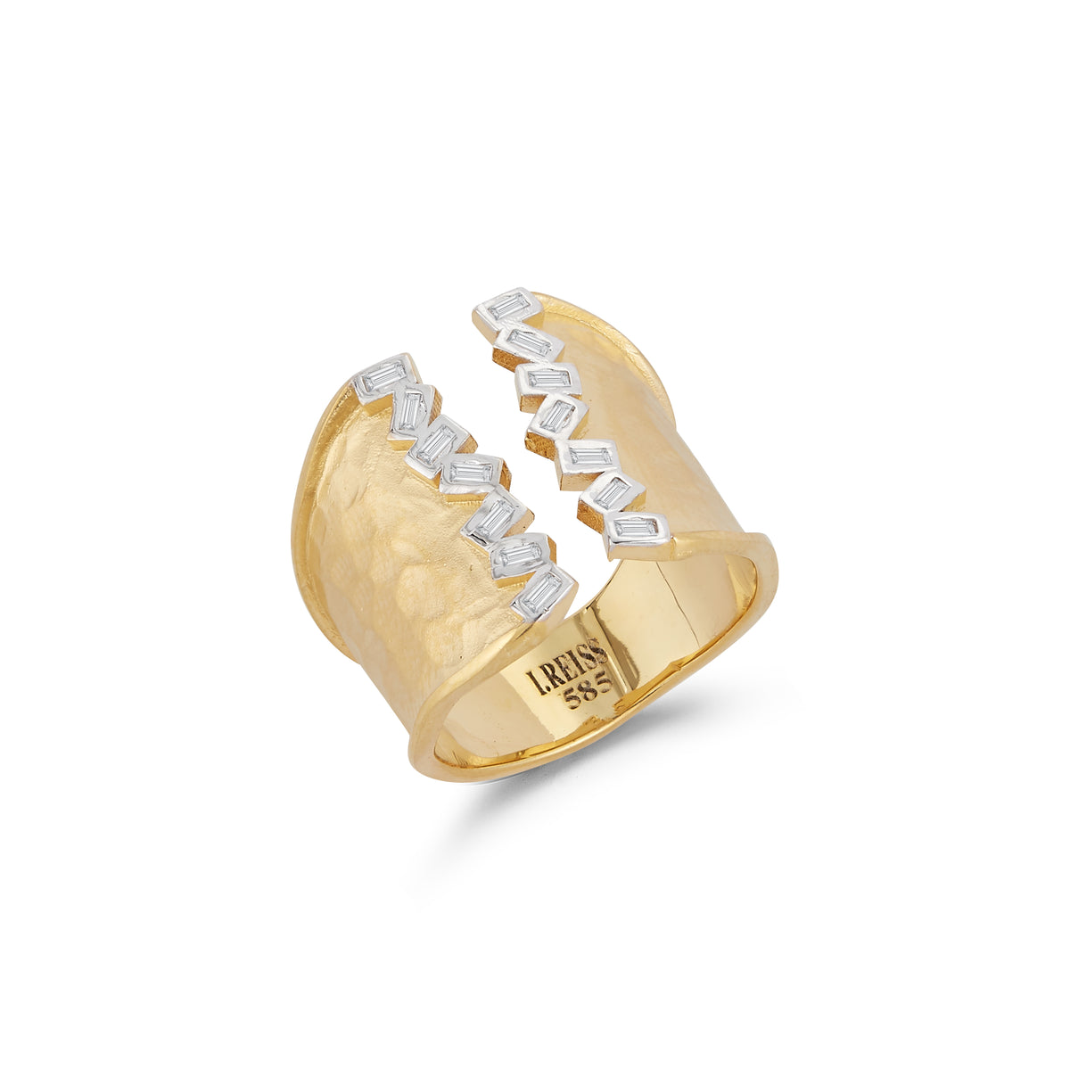 14 karat yellow gold matte and hammer-finished open cuff ring enhanced with 0.21 carats of baguette diamonds