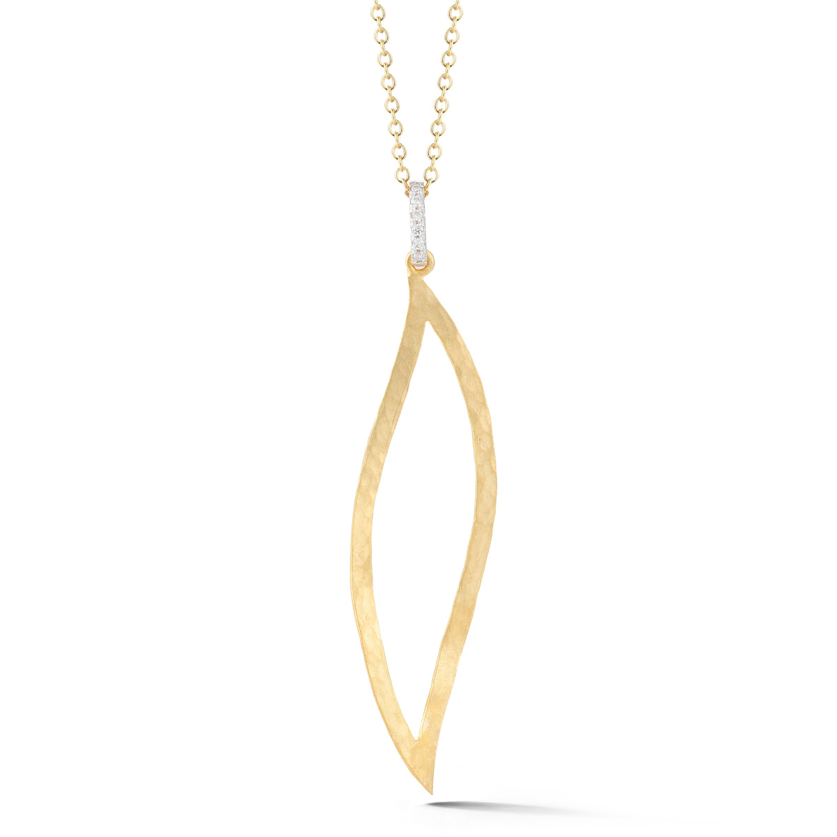 14 karat yellow gold matte and hammer-finish open leaf pendant accented with 0 06 carat of pave set diamonds