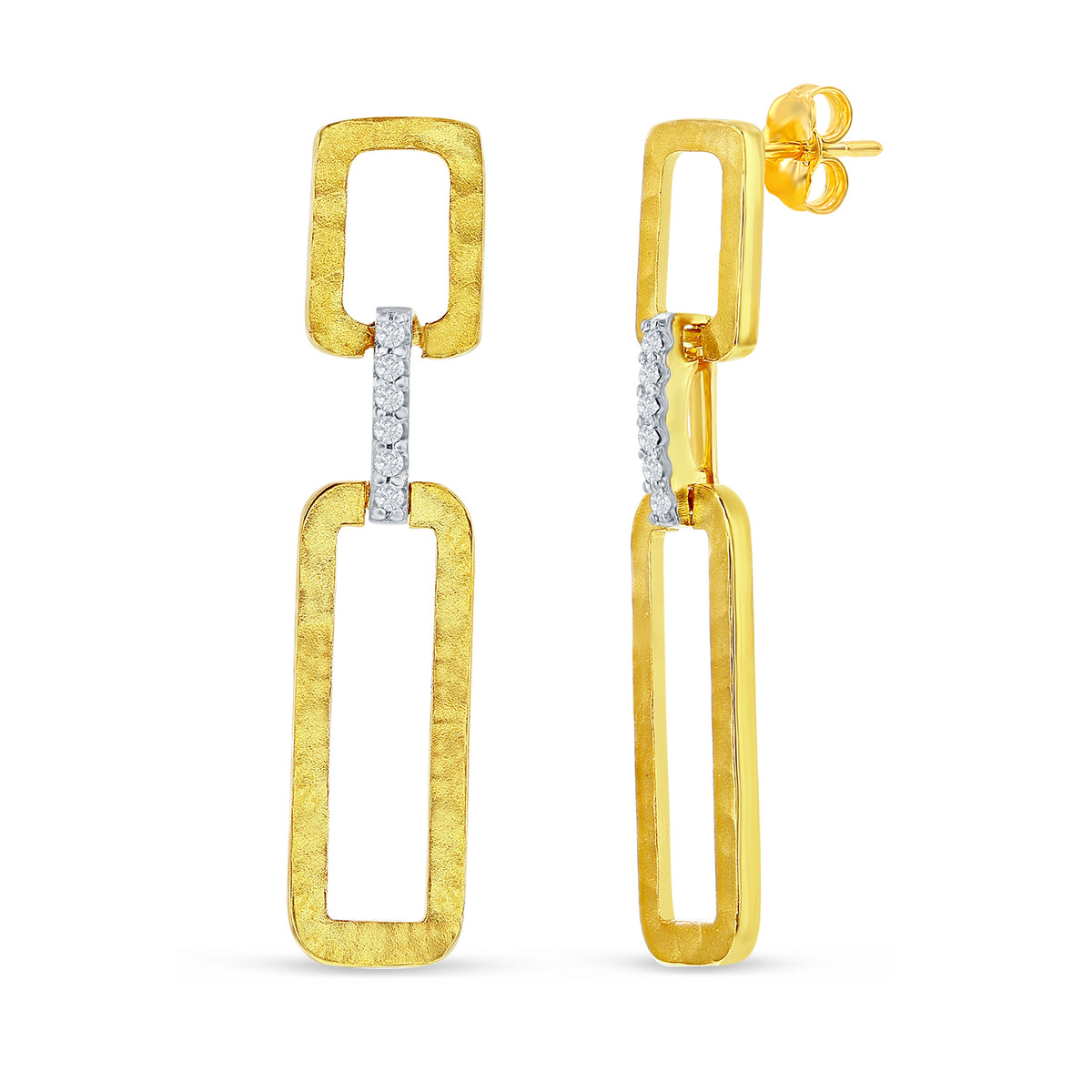 14 karat yellow gold matte and hammer-finished dangling open link rectangular earrings, accented with 0.07 carats of pave set diamonds.
