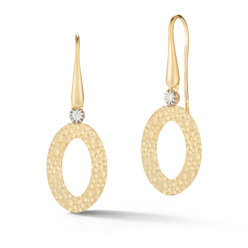 14 karat yellow gold matte and hammer-finished open oval dangling earrings, accented with 0.08 carats of prong set diamonds.