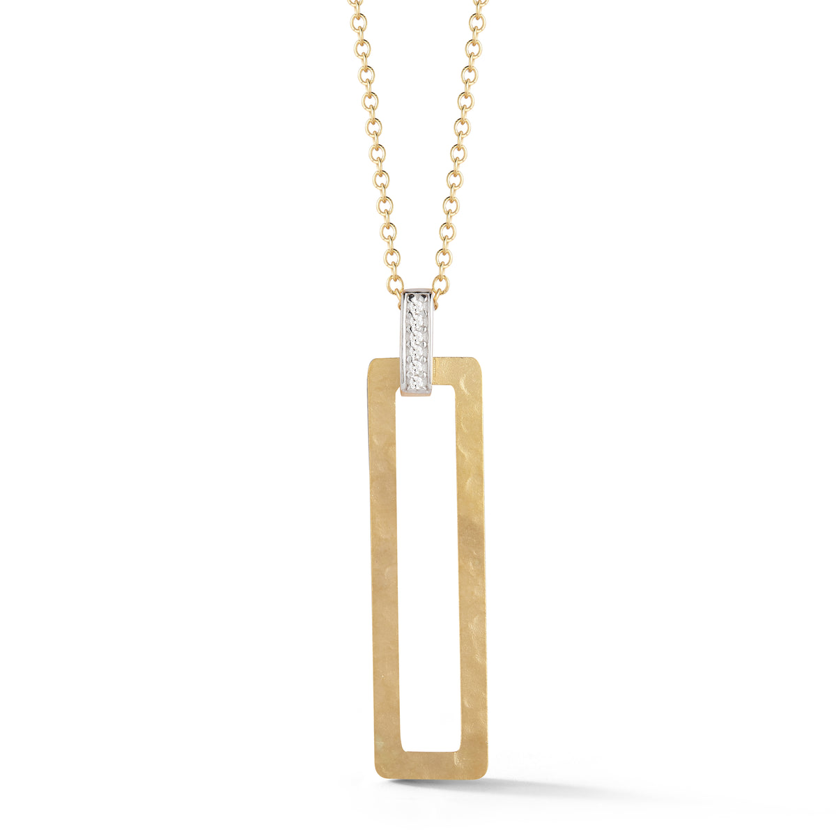 14 karat yellow gold matte and hammer-finished open rectangle pendant accented with 0 05 carats of pave set diamonds sliding on a 16 rolo chain