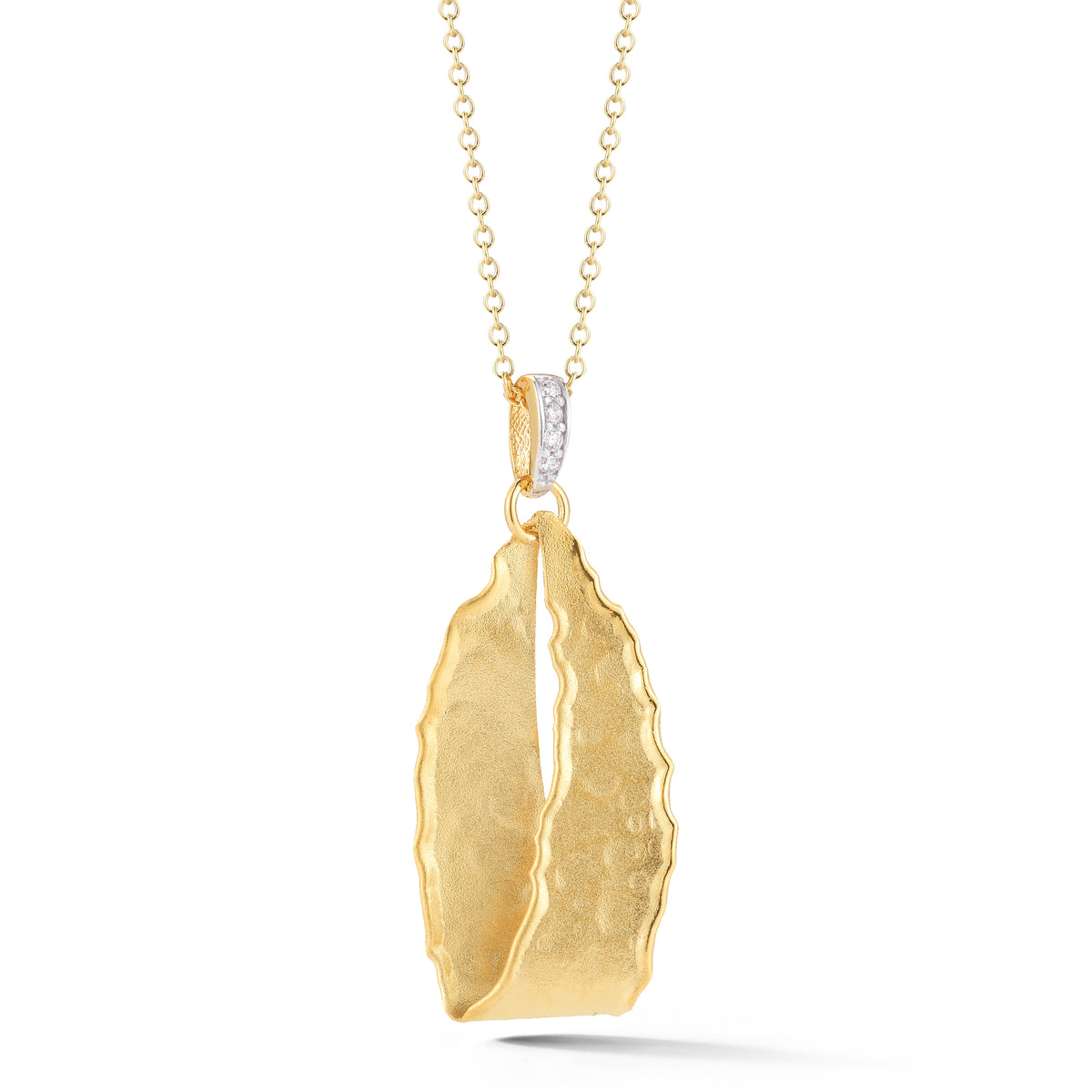 14 karat yellow gold matte and hammer-finished ribbon pendant accented with 0 04 carat of pave set diamonds sliding on a 16 rolo chain