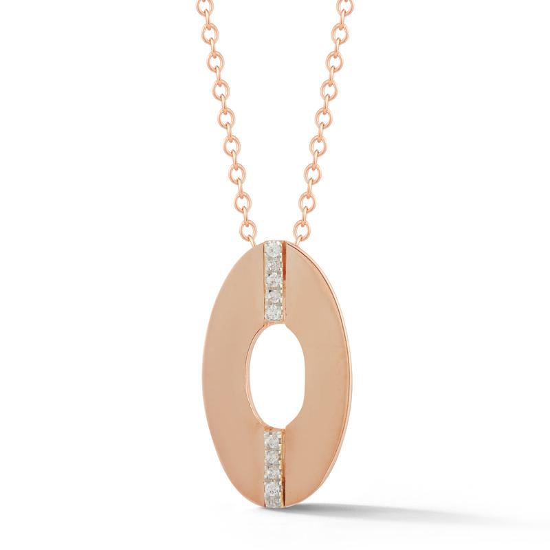 14 karat yellow gold polish-finished small open oval pendant enhanced with 0 06 carats of pave set diamonds sliding on a 16 rolo chain
