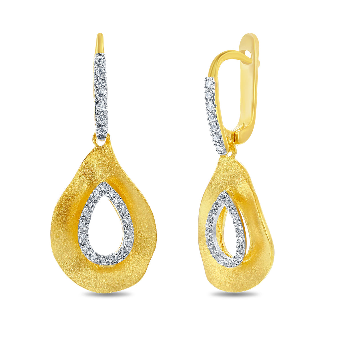 14 karat yellow gold matte-finished dangling tear-drop earrings, accented with 0.30 carts of pave set diamonds.