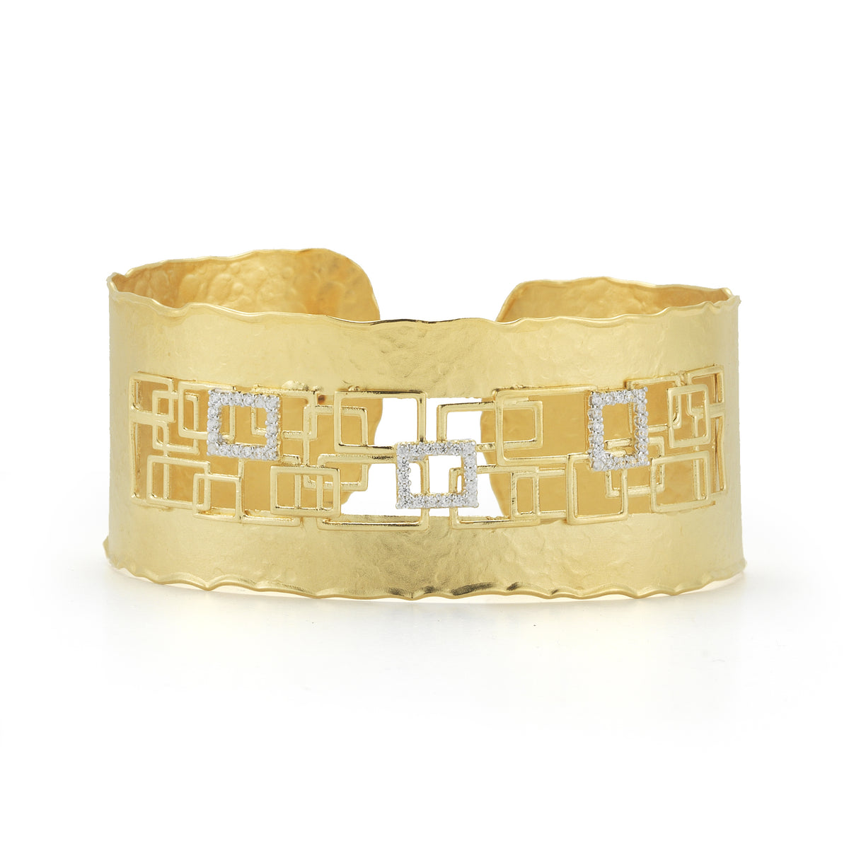 14 karat yellow gold matte and hammer-finished scallop-edge vitrage cuff bracelet enhanced with 0 35 carats of pave set diamonds